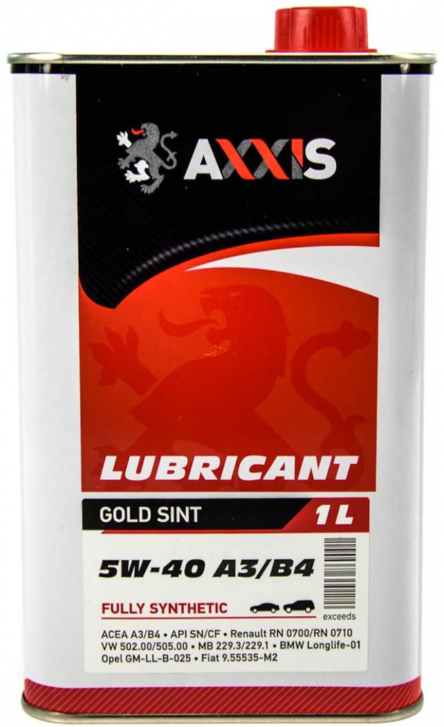 Axxis 5W-40 A3/B4 Gold Sint — це універсальна синтетична моторна олива з високими експлуатаційними характеристиками, виготовлена на основі базового масла Group IV. Призначена для бензинових і дизельних двигунів легкових автомобілів та мікроавтобусів. Також підходить для автомобілів, що працюють на скрапленому газі (LPG) та легких вантажівок.