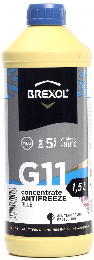 Brexol Blue Concentrate G11 — концентрований антифриз на основі MEG (моноетиленгліколю), призначений для використання в системах охолодження бензинових і дизельних двигунів. Забезпечує надійний захист від замерзання, перегріву та корозії, ефективно запобігає утворенню накипу й відкладень, подовжуючи термін служби радіатора та елементів системи охолодження.