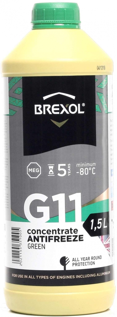 Brexol Green Concentrate G11 — концентрований антифриз на основі MEG (моноетиленгліколю), призначений для систем охолодження бензинових і дизельних двигунів. Забезпечує ефективний захист від замерзання, перегріву та корозії, запобігає утворенню накипу й відкладень, подовжуючи термін служби радіатора та елементів системи охолодження.