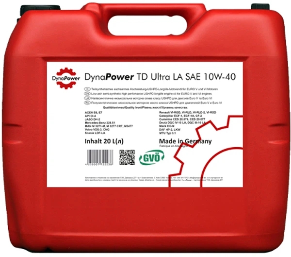 DynaPower TD Ultra LA SAE 10W-40 – моторна олива класу USHPD, призначена для дизельних вантажних автомобілів нового покоління, що відповідають екологічним нормам Euro IV, Euro V та Euro VI щодо обмеження вмісту сажі й оксидів азоту у вихлопних газах.