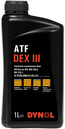 Dynol ATF Dex III — трансмісійна рідина для автоматичних коробок передач легкових автомобілів, що відповідає специфікації General Motors Dexron IIIG. Також підходить для гідравлічних підсилювачів керма легкової та вантажної техніки, коробок передач будівельної й аграрної техніки, гідравлічних механізмів у промисловості та інших вузлів.