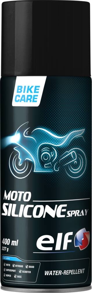 Elf Moto Spray Silicone – аерозольний засіб для догляду за мотоциклом та його аксесуарами. Призначений для захисту деталей від вологи, полірування поверхонь та відновлення шкіри. Забезпечує матовий або глянцевий ефект на оброблених поверхнях.