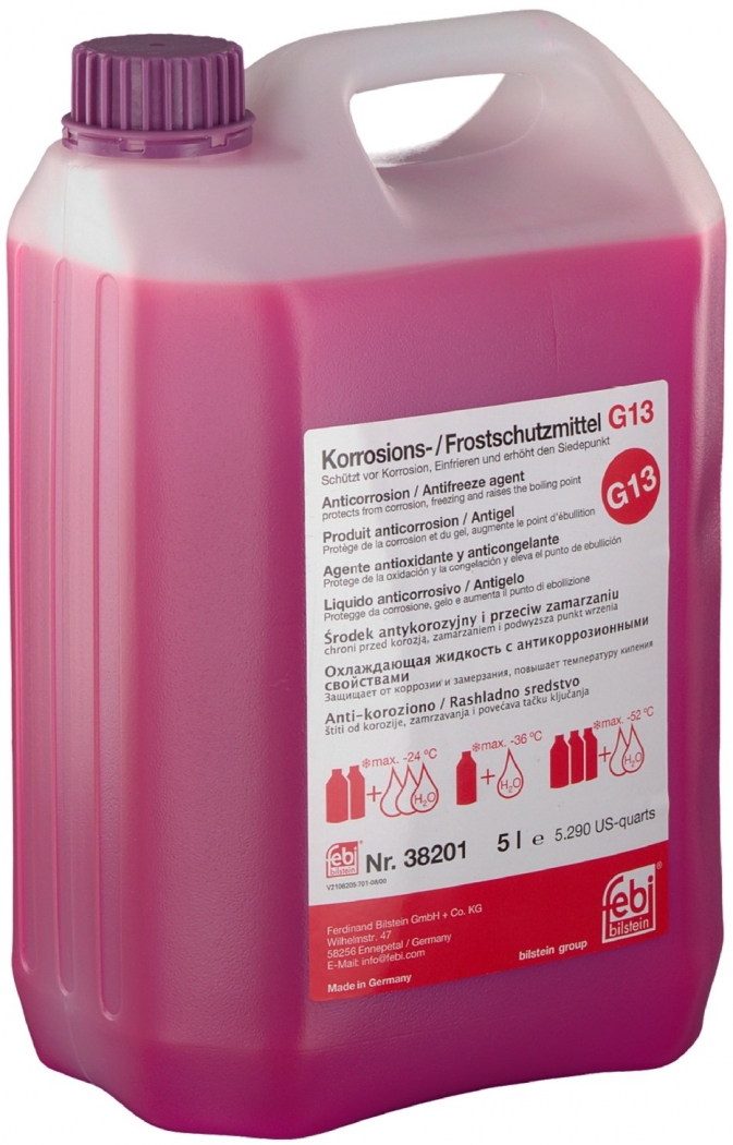 Febi Bilstein Antifreeze G13 Concentrate - високоякісний концентрований антифриз нового покоління, розроблений для сучасних систем охолодження легкових і комерційних автомобілів. Виготовлений за технологією Lobrid (HOAT) з використанням гліцерину, що забезпечує ефективний тепловідвід та знижений вплив на довкілля.