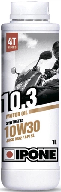 Напівсинтетична моторна олива для 4-тактних мотоциклів, створена з урахуванням вимог двигунів класичної компоновки. Ipone 10.3 10W-30 є оптимальним вибором для повсякденного використання з періодичним підвищенням обертів, без постійної роботи на максимальних навантаженнях.