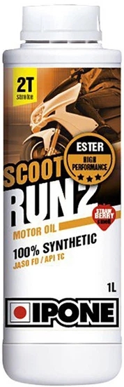 100% синтетичне моторне масло для 2-тактних скутерів з ароматом полуниці у вихлопних газах. Виготовлене на основі поліальфаолефінів (ПАО) та складних ефірів (естерів), що забезпечує рівень характеристик, придатний для спортивного використання та роботи на високих обертах. Ipone Scoot Run 2 створене для максимально динамічної експлуатації.
