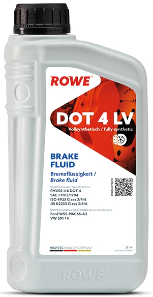 Rowe Hightec Brake Fluid DOT 4 LV — це повністю синтетична низьков’язка гальмівна рідина для сучасних систем ECU та ABS на основі гліколів з інгібіторами корозії та окиснення. Відзначається високими резервами температури кипіння у сухому та зволоженому стані та відповідає специфікаціям DOT 4 і ISO Class 6.