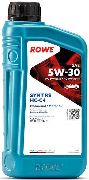 Rowe Hightec Synt RS SAE 5W-30 HC-C4 — моторна олива на основі відбірних базових масел HC-Synthese, призначена для бензинових і дизельних двигунів. Вона відповідає вимогам специфікації ACEA C4 завдяки низькому вмісту сульфатної золи (SA) та оптимальному показнику HTHS (високотемпературна в’язкість при високій швидкості зсуву).
