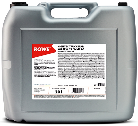 Rowe Hightec Truckstar SAE 10W-40 Multi-LA — моторна олива нового покоління для дизельних двигунів із надвисокими навантаженнями (SHPD) зі зниженим вмістом сірки, фосфору та сульфатної золи (Low SAPS), виготовлена на основі сучасних присадок і HC-Synthese базових масел. Спеціально розроблена для сучасних дизельних двигунів із системами нейтралізації відпрацьованих газів у вантажних автомобілях, автобусах і спецтехніці.