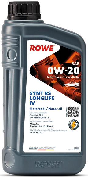 Rowe Hightec Synt RS Longlife IV SAE 0W-20 — частково синтетична моторна олива для важких умов експлуатації з оптимізованими в’язкісно-температурними властивостями. Розроблена спеціально для сучасних бензинових і дизельних двигунів легкових автомобілів із системами нейтралізації відпрацьованих газів, з турбонаддувом і без нього. Підходить для двигунів із подовженими інтервалами обслуговування.
